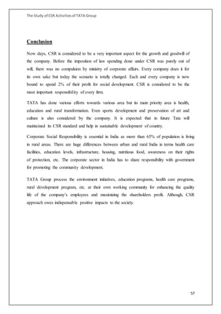 The Study of CSR Activitiesof TATA Group 1 Introduction Corporate social responsibility is a form of corporate self-regulation integrated into a business model. At Tata Steel our. Corporate Social Responsibility CSR We firmly adhere to the Tata group philosophy of giving back to society many times over.
